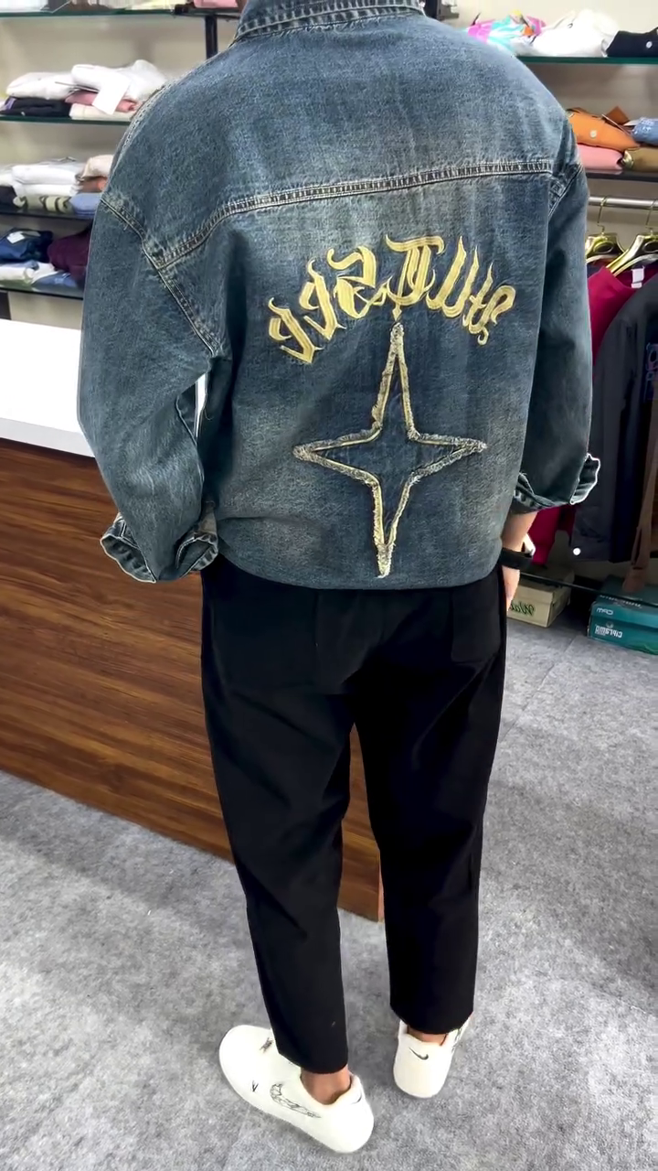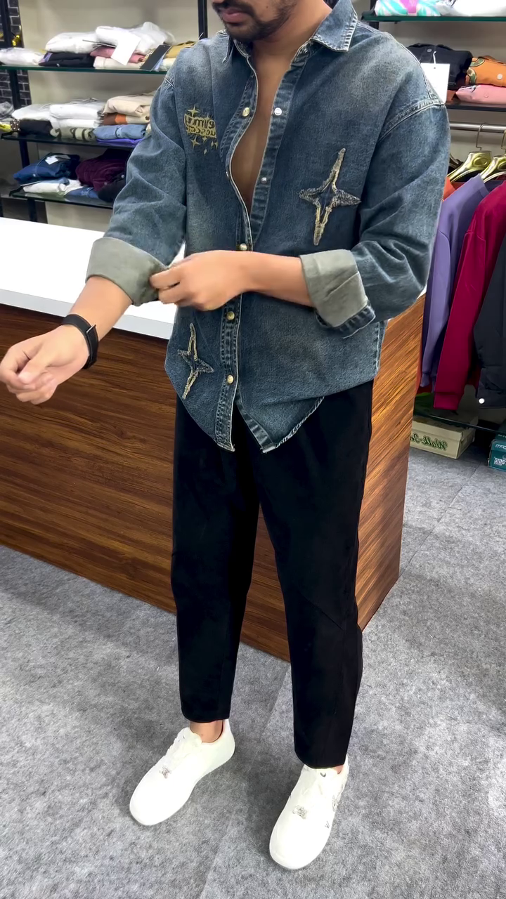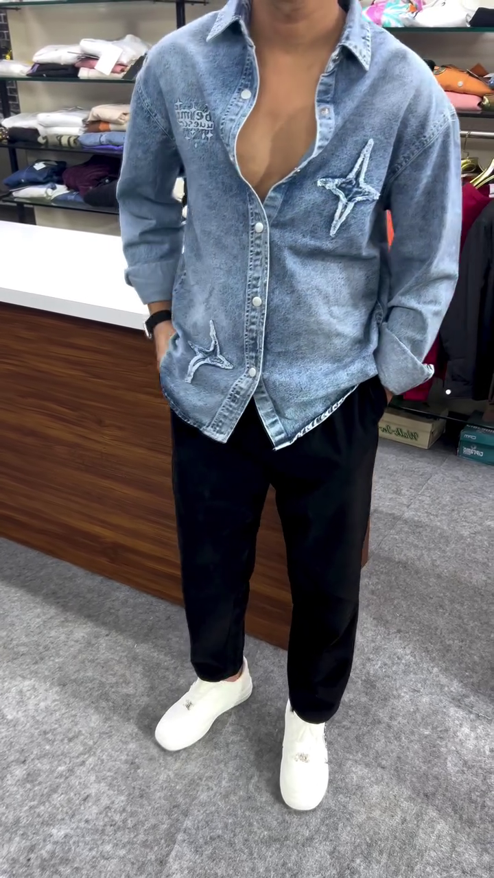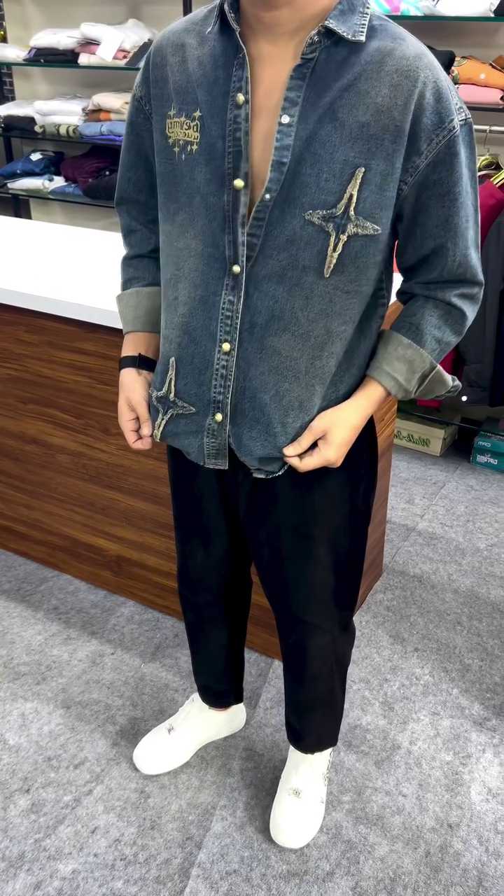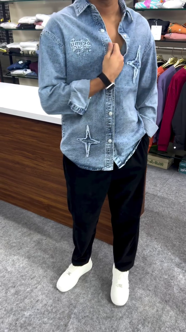 Made from high-quality soft-washed denim fabric, this shirt feels smooth on the skin while maintaining a strong, structured fit 💪🧵. The unique embroidered star-style patches and artistic detailing on the front give it a premium designer appearance ⭐🎨 that grabs attention from every angle.