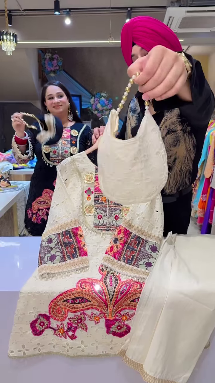 The embroidery is a standout feature, showcasing a mix of floral and geometric motifs in lively shades of pink, orange, green, and other complementary tones. The patterns are thoughtfully arranged to create visual harmony, with each stitch reflecting skilled craftsmanship and attention to detail.