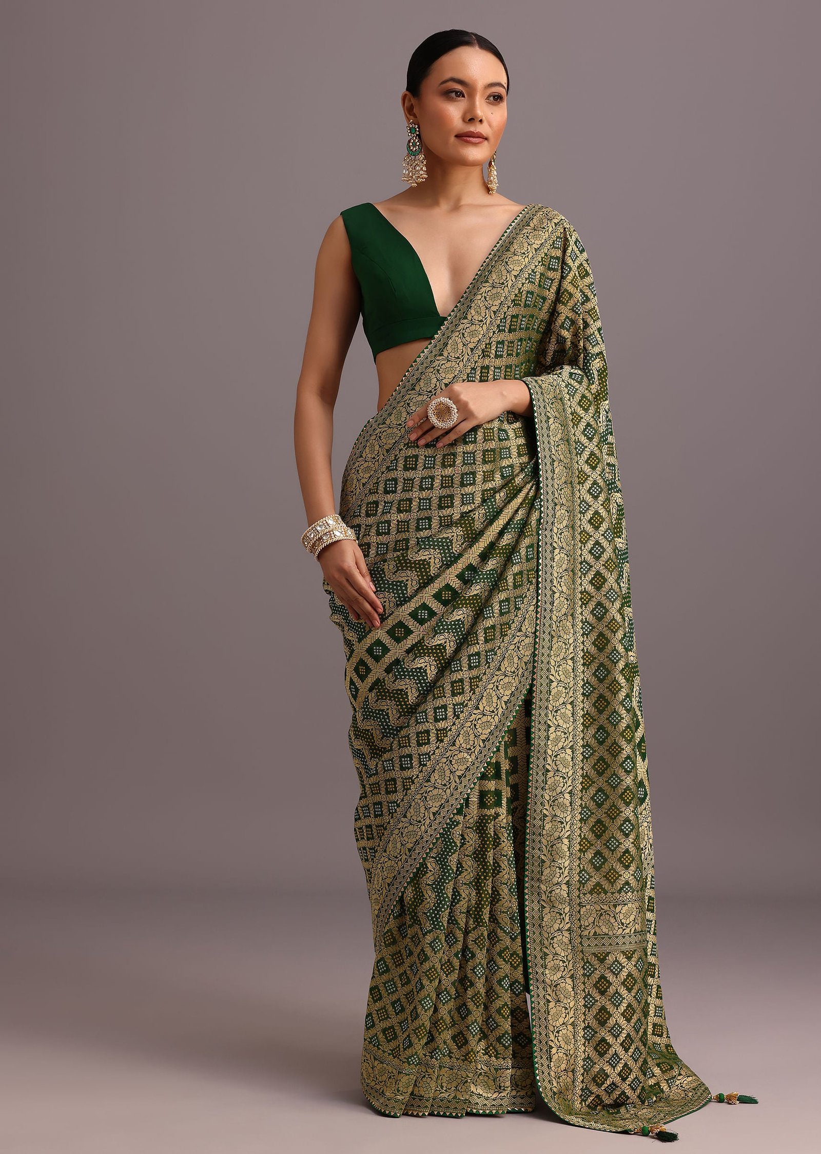 Deep emerald green base with traditional bandhani‑style dotted weave 💚